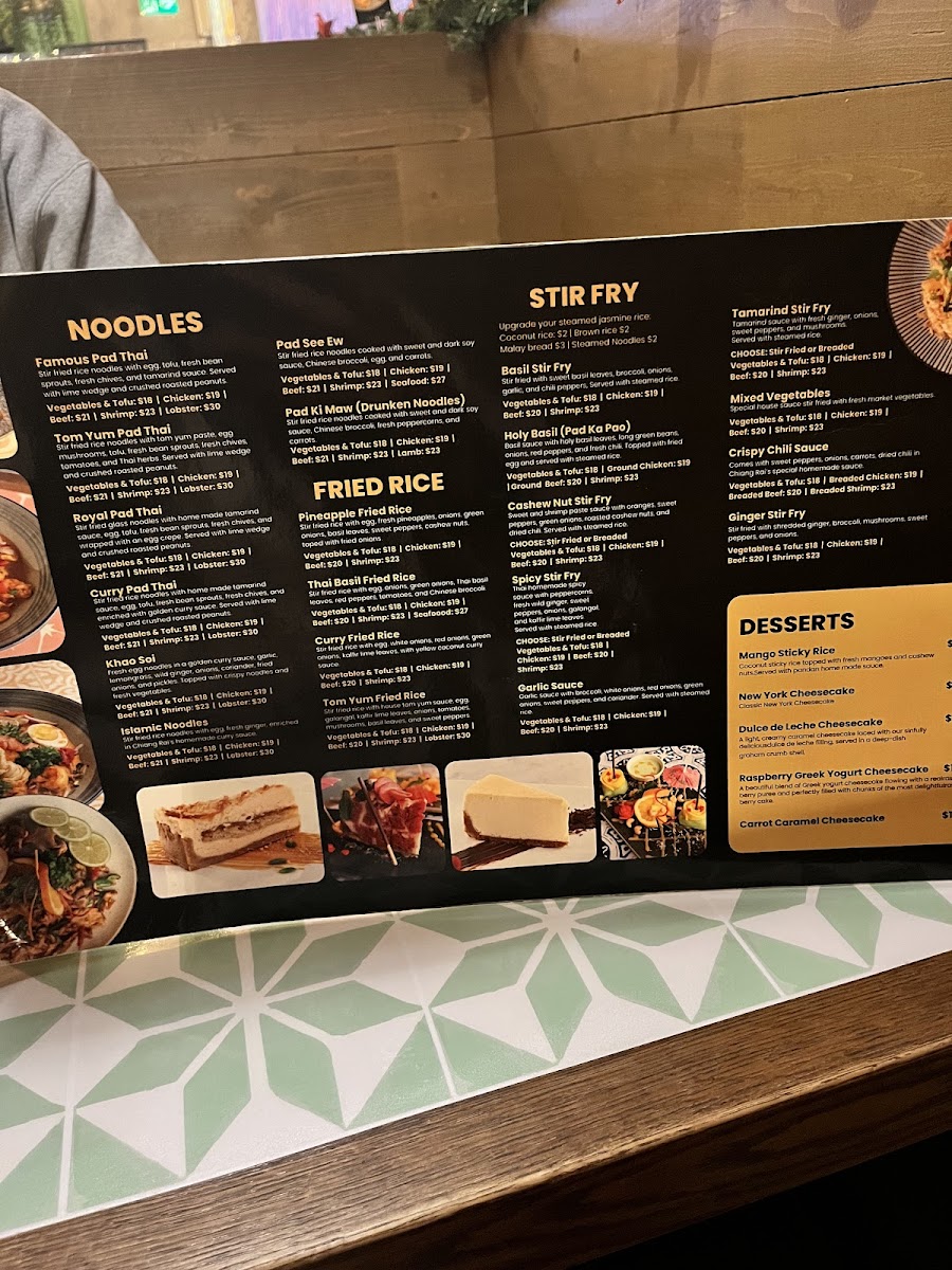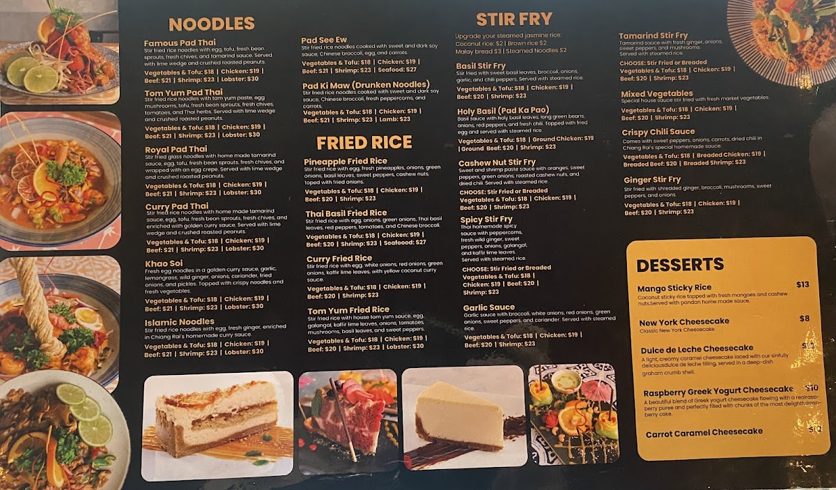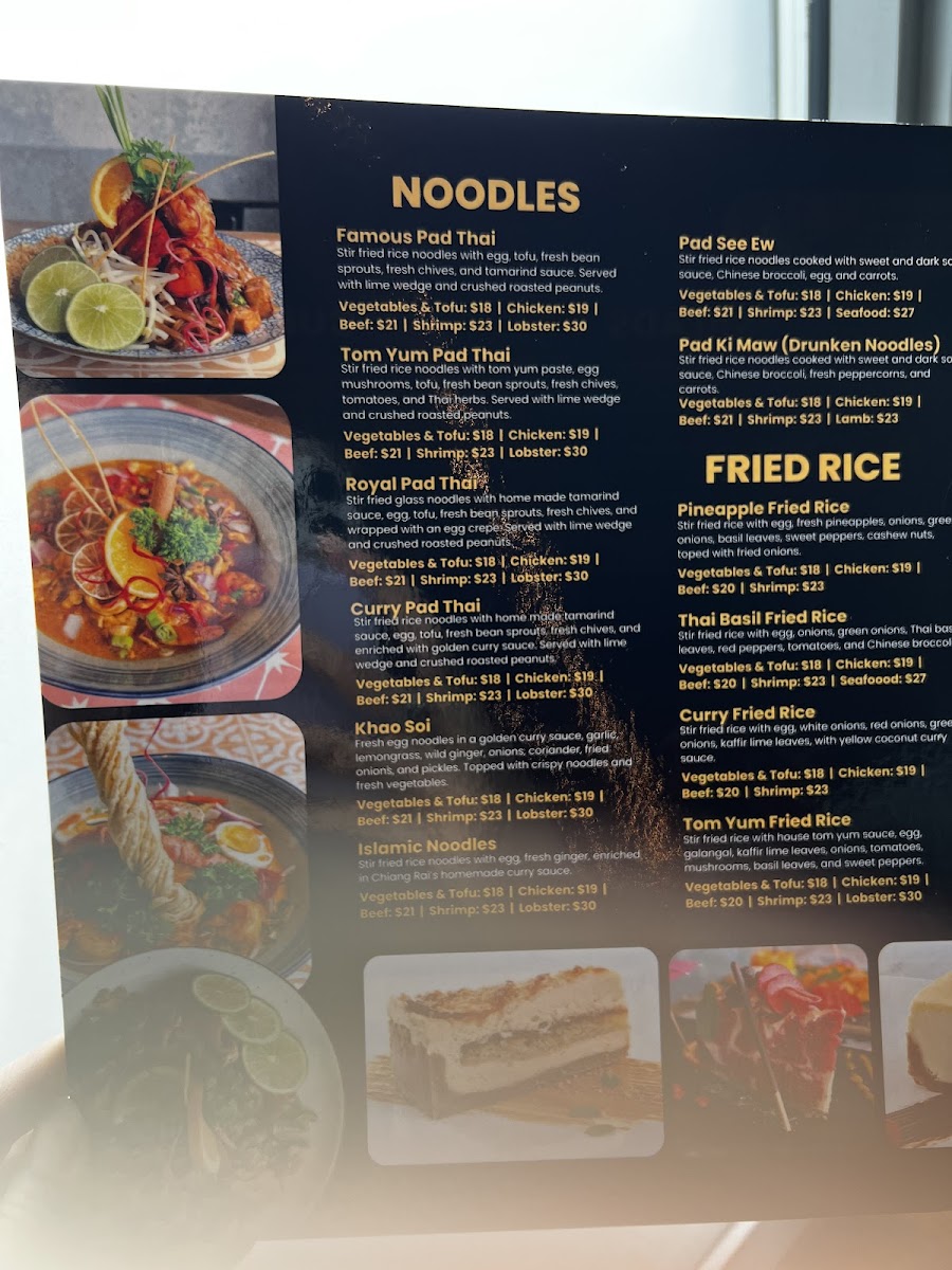 Cuisine Type: The menu celebrates the rich flavors of Thai cuisine, featuring a delightful array of curries and stir-fried noodles. Each dish is crafted with meticulous attention to detail, bringing forth vibrant colors and enticing aromas.