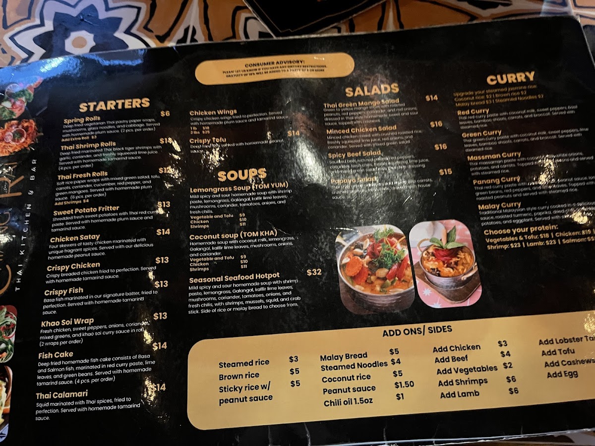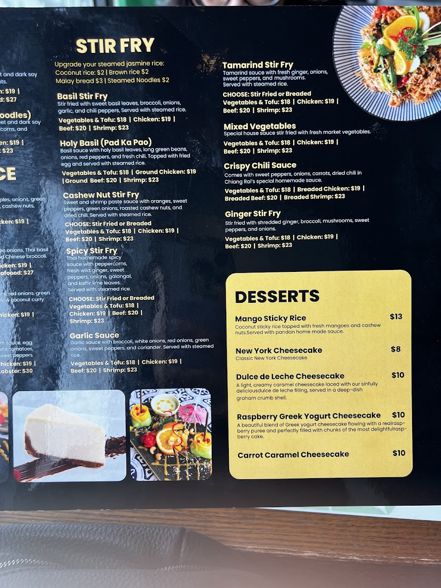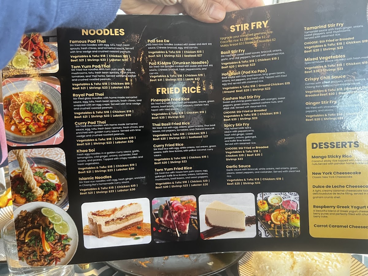 Cuisine Type: The menu celebrates the rich flavors of Thai cuisine, featuring a delightful array of curries and stir-fried noodles. Each dish is crafted with meticulous attention to detail, bringing forth vibrant colors and enticing aromas.